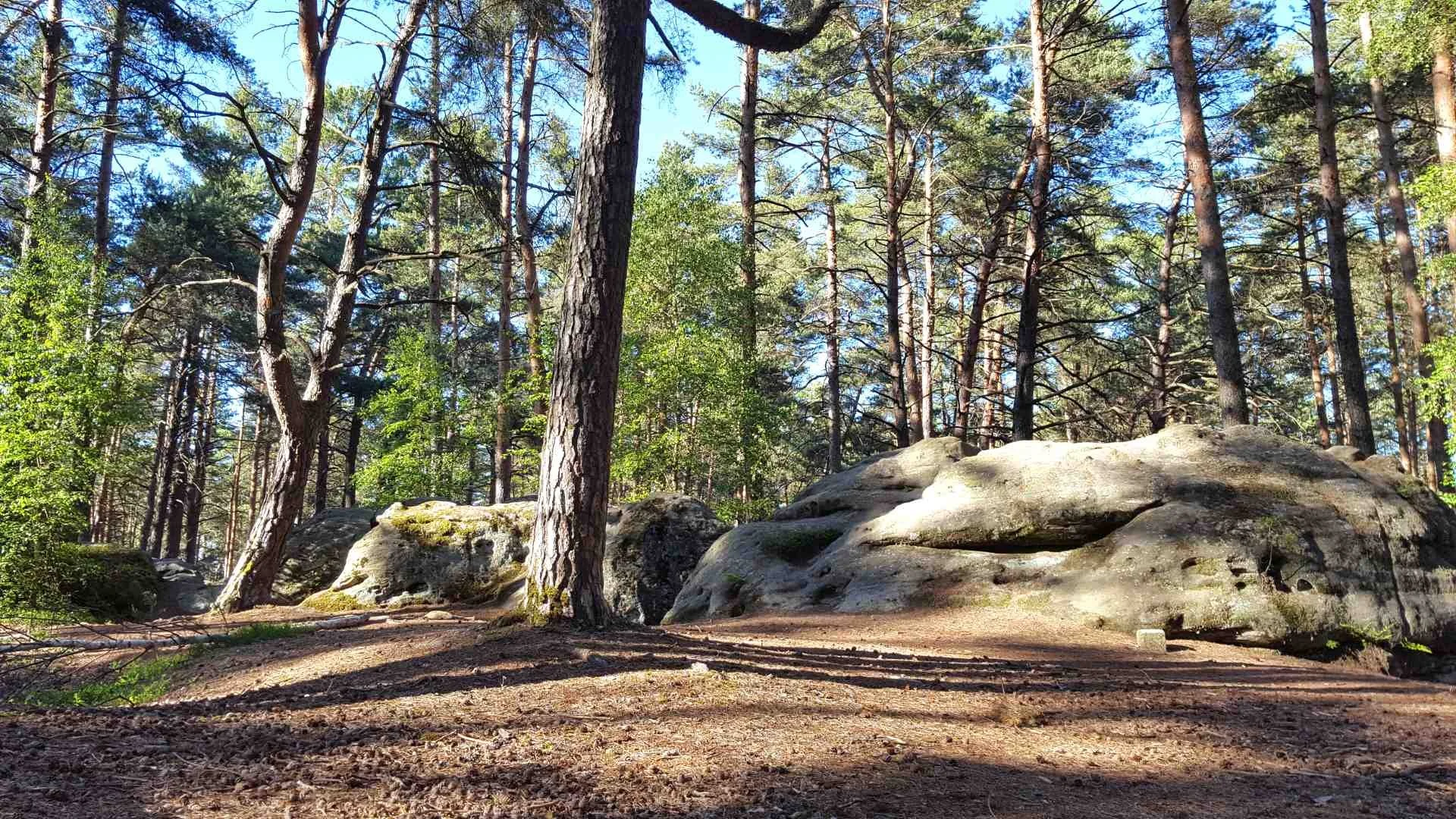 An der Kreuzung gleich nach dem Sonnenland links halten und einen Kilometer auf Schotter an dem Weiler Lochau vorbei bis zu Straße fahren. An der Straßenkreuzung scharf links abbiegen und das kurze Stück Straße bergab und dann durch das Dorf Vorlahm fahren. Beim Reiterhof endet die Straße und teilt sich in zwei Hohlwege, von diesen den rechten nehmen (7) und 500 Meter steil bergauf bis zum Wegkreuz pedalieren. An der Kreuzung links auf den Rundweg 4 (Wegmarkierung mit Vogel) abbiegen, der auf Schotter auf die Anhöhe des Burgstalls führt. Nach weiteren 500 Metern sollte man rechterhand an der Bank unbedingt eine Pause einlegen. Der mit Laubwald bedeckte Burgstall ist ein Ort mit besonderer Atmosphäre, vielleicht das, was man einen “Kraftort” nennt. Von hier aus kann man den Blick an der Neubürg vorbei bis tief in die Fränkische Schweiz schweifen lassen (8).