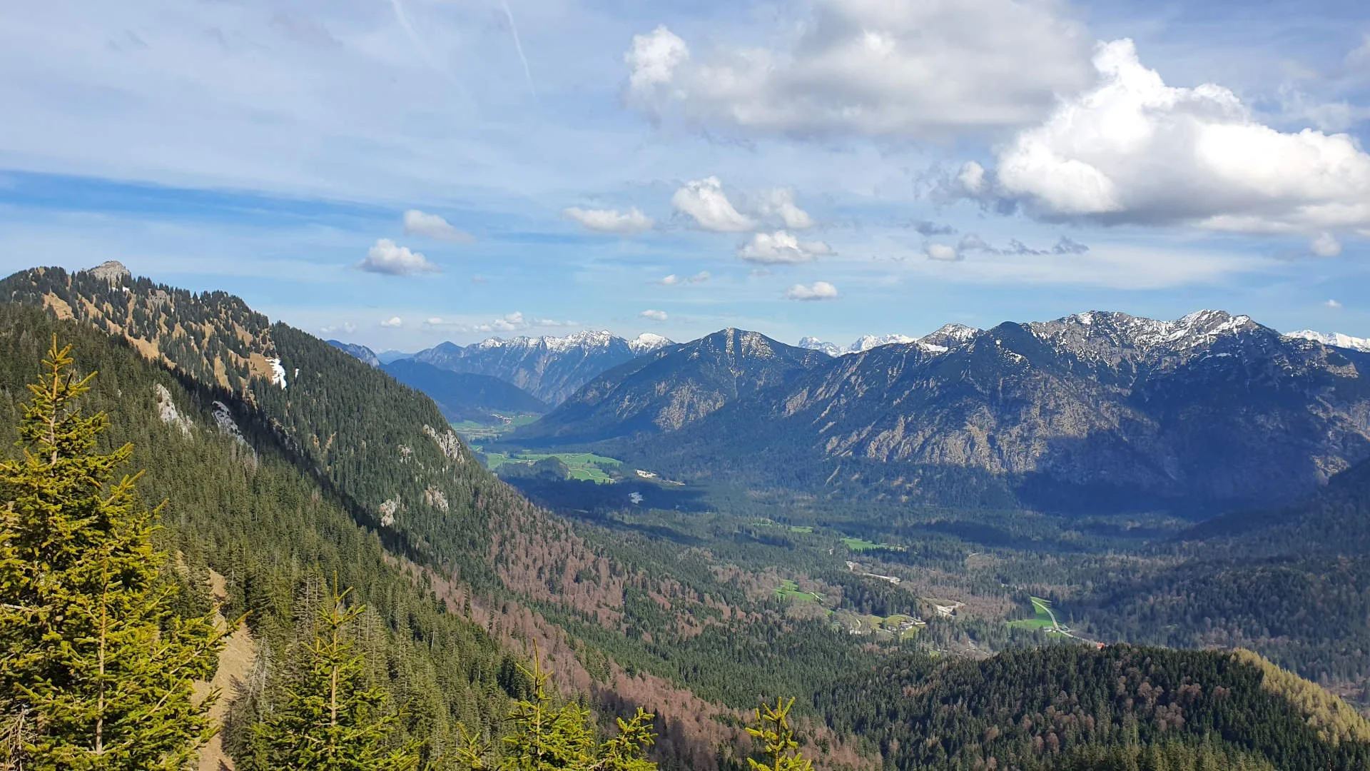 Kurz vor der Brunnenkopfhütte kommt man aus dem Wald heraus. Die Hütte liegt 1.600 Meter hoch. Auf der Terrasse wird man von einem Traumblick nach Norden über das Graswangtal empfangen. Am Horizont sind Anfang Mai die Gipfel des Estergebirges noch mit Schnee überzuckert. Auch Kramer und Kienjoch und die Wettersteinwand, die hervorspitzt, haben noch weiße Köpfe.
