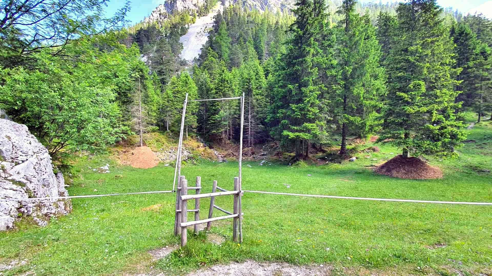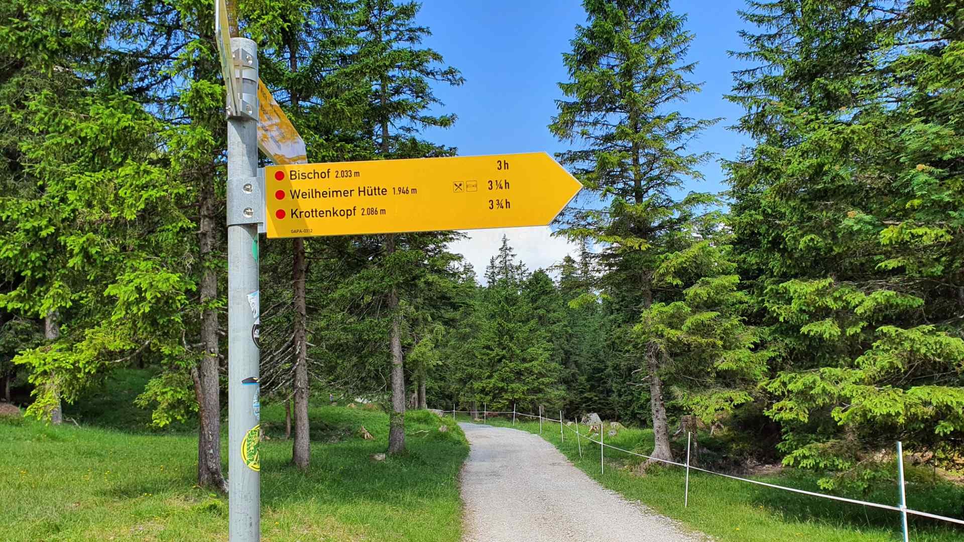 Der Weg zum Fricken ist nicht ausgeschildert, man folgt also erst einmal dem Wegweiser Richtung Bischof, Weilheimer Hütte und Krottenkopf. Durch einen Dreieckdurchgang passiert man den Weidezaun. Die Wiese gehört zum Almgebiet der nahegelegenen Esterbergalm. Im Sommer grasen hier Kühe und beobachten gleichmütig das Kommen und Gehen der Wanderer, die hauptsächlich von der Weilheimer Hütte kommen oder dorthin unterwegs sind.
