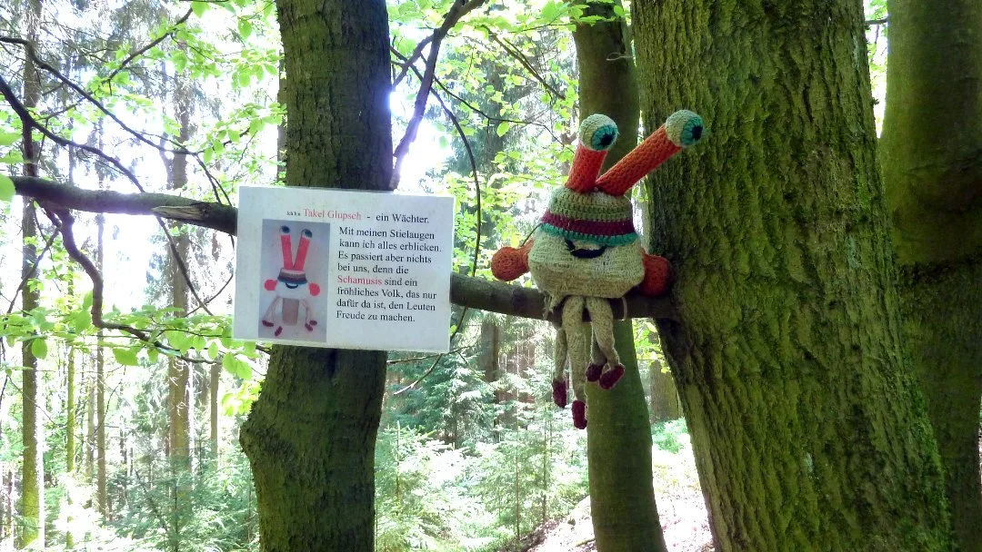Hinter der Gänskopfhütte, im Hochwald oberhalb des Hahnenbachs wohnen die Schamusis, die man allerdings normalerweise nicht zu Gesicht bekommt. Unübersehbar sitzen aber alle paar Meter gehäkelte Wichtel in den Ästen der Bäume. Sie heißen Glupsch, Mulle Kullerauge, Würmchen oder Dickie Monster und beschützen ihre Freunde, die Schamusis (14). Der Schamusiweg ist ein riesen Spaß vor allem für Familien mit Kindern. Deshalb sollte man diesen Pfad nicht zu Zeiten befahren, wenn viele Wanderer unterwegs sind, sondern bei Betrieb das erste Stück durch den Wald lieber schieben.