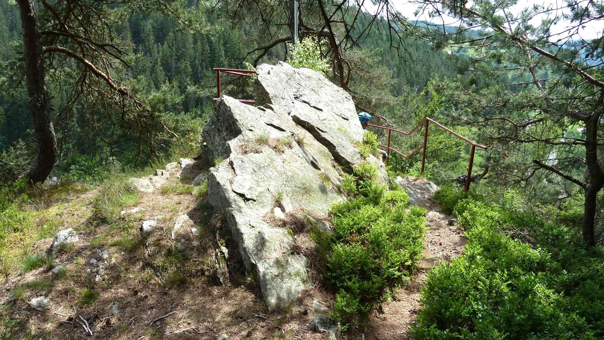 Fleckl ist der äußerste Punkt der Tour. Retour geht es zunächst auf demselben Weg zurück zum Geiersberg und weiter auf dem Waldtrail bis zur Gabelung. Jetzt nicht links bergab wieder nach Oberwarmensteinach, sondern weiter geradeaus auf dem schmalen Pfad, bis man nach kurzer Fahrt den Höllfelsen erreicht (10). Ein Stopp ist absolut empfehlenswert. Der Felsen liegt an exponierter Stelle und bietet einen tollen Blick nach Süden über das Tal der Warmen Steinach. Das kurze steile Stück runter ins Tal ist theoretisch fahrbar, aber nur mit solider Trailerfahrung, sonst lieber schieben.
