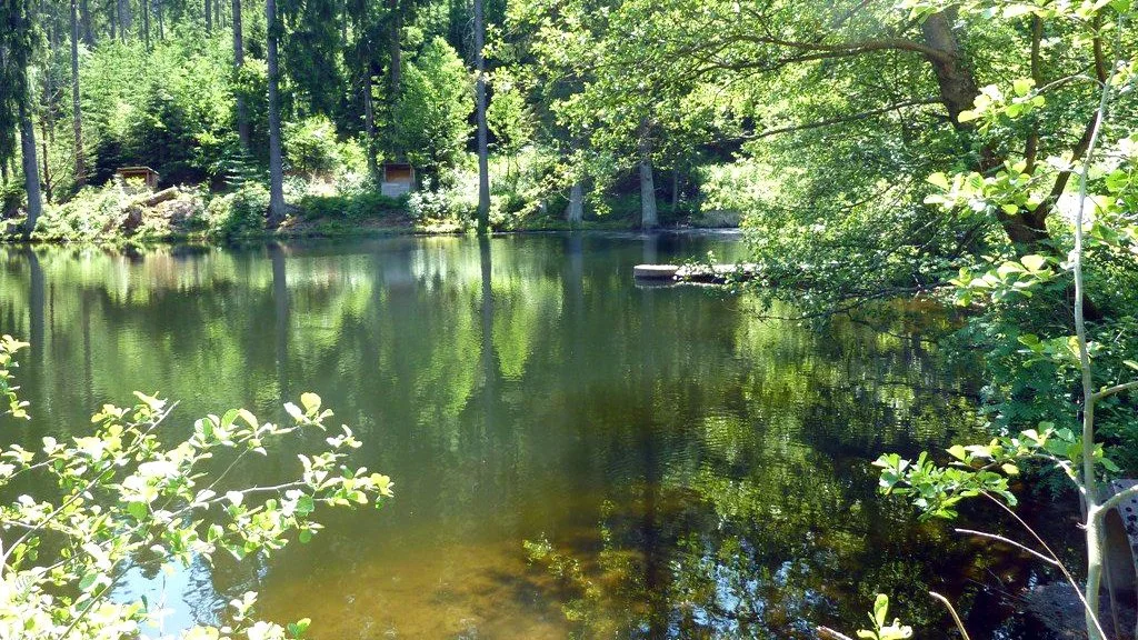 Weiter geht es auf dem Radweg (3), vorbei am Brunnenhaus bis zum Pfeiferhaus. Kurz nach dem Pfeiferhaus an einem Wegkreuz rechts auf den Schotterweg abbiegen, der etwas steiler bergauf und nach einer scharfen Rechtskurve am Schanzberg entlang durch das Wurzbachtal führt. Nach einem guten Kilometer rollt man aus dem Wald heraus und kommt am Wurzbachweiher zum Stehen (4). Wasser und Wald schimmern in hundert verschiedenen Grüntönen. Hier muss man einfach eine Pause einlegen. Es gibt nicht nur eine Bank zum Sitzen, sondern sogar einen Einstieghilfe in den See, falls man ein Bad im See nehmen möchte. Am Ufer gegenüber sind unter Fichten überdachte Sitzgelegenheiten verstreut. Was für eine Idylle.