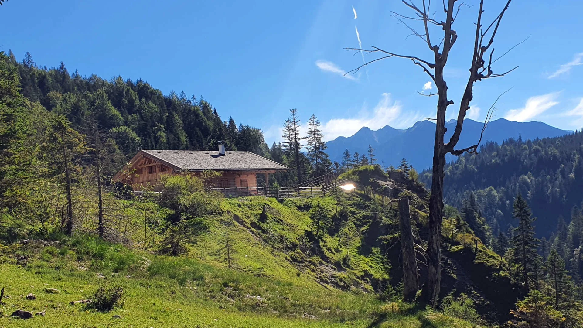 Erinnerungen werden wach an die endlose Auffahrt auf die Fischbachalm auf einer meiner ersten MTB-Touren überhaupt, damals mit einem gelben Merida-Hardtail mit V-Brakes. Es war Anfang Mai und die Alm leider noch geschlossen. Diesmal ist die Alm geöffnet, einkehren möchte ich aber lieber erst im Soiernhaus. Also lasse ich die Räder bergab zum Hundsstall laufen. Nach der ersten Kurve kommt, noch ganz klein, das Soiernhaus auf einem Felssporn in Sicht.
