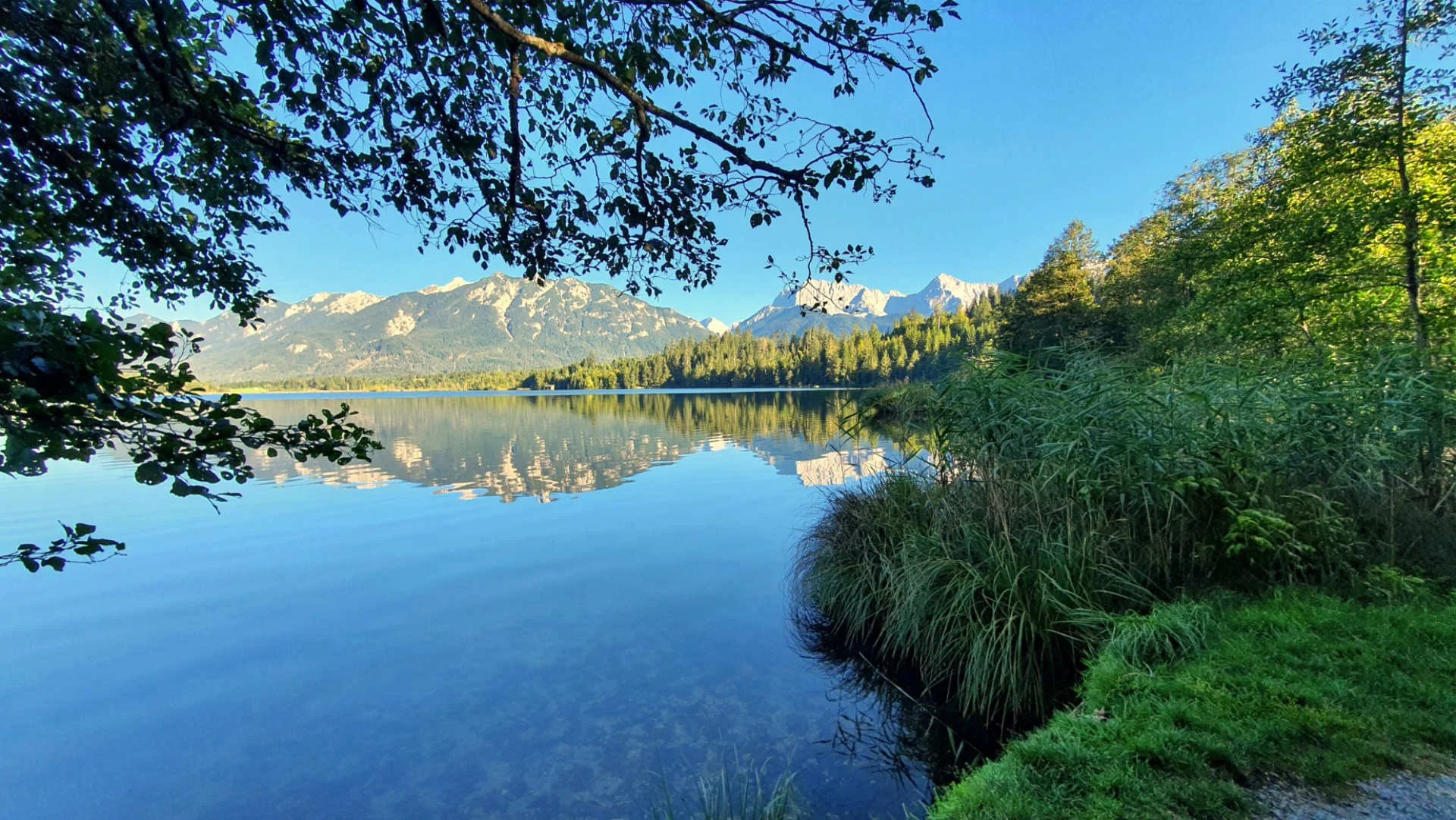 Zurück am Radl-Parkplatz bei der Materialseilbahn heißt es wieder auf den Sattel und auf demselben Weg wie bei der Hinfahrt über die Fischbachalm zurück nach Krün. Ab Krün folgt man den Wegweisern Richtung Barmsee und Geroldsee. Als ob man an diesem Tag nicht schon genug Eindrücke bekommen hätte, ist die Fahrt entlang der beiden Bergseen ein weiteres Highlight der Tour. Normalerweise wird es auf der Rückfahrt schon Nachmittag sein. Dann steht die Sonne schon tiefer, was das Grün der Buckelwiesen noch satter, das Dunkelblau des Barmsees noch tiefgründiger und die Silhouette des Wettersteingebirges im Gegenlicht noch entrückter erscheinen lässt. Ich kann mir kaum ein oberbayerisches Motiv vorstellen, das noch idyllischer wäre als der Blick auf den Geroldsee und das Wettersteingebirge im Hintergrund.