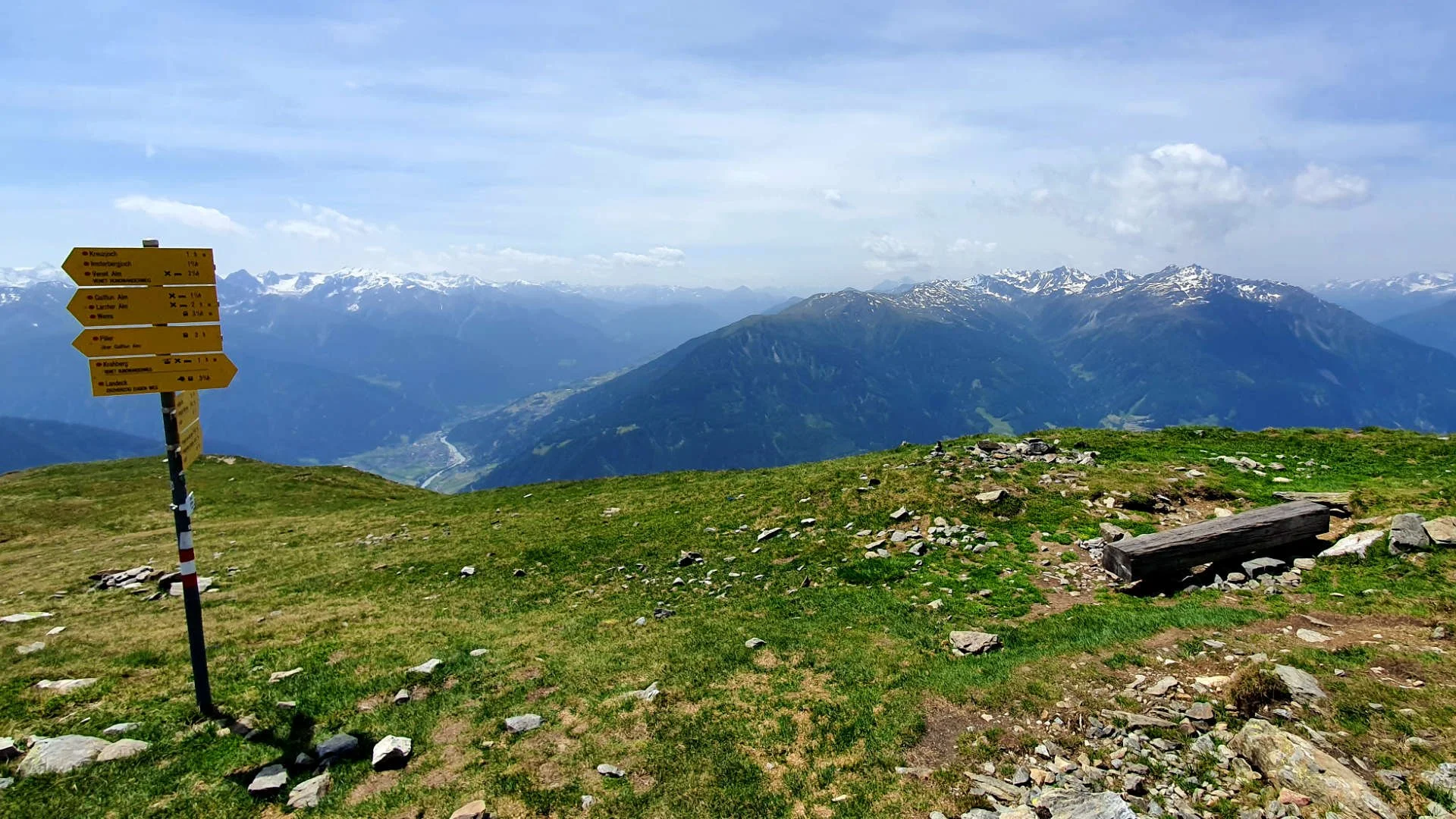 Der nächste Tag ist bikefrei. Mit der Venetbahn lassen wir uns von Landeck auf den Krahberg gondeln und wandern über den Bergrücken des Venetmassivs auf die Glanderspitze. Der Venet ist ein 15 Kilometer langer Bergstock, der wie eine Insel zwischen Ötztaler Alpen, Lechtaler Bergen und Samnaungruppe aufragt. Durch seine isolierte Lage ist er ein perfekter Panoramaberg. Die Rundumsicht auf der Glanderspitze, der höchsten Erhebung des Venet, haut einen tatsächlich um. Kaunergrat und Samnaungruppe sind zum Greifen nah. Die meisten Gipfel rundherum, von denen viele 3.000 Meter und höher sind, haben noch Schneeflecken. Dunstig im Norden kann man die Mieminger Gruppe und sogar die Zugspitze erkennen.