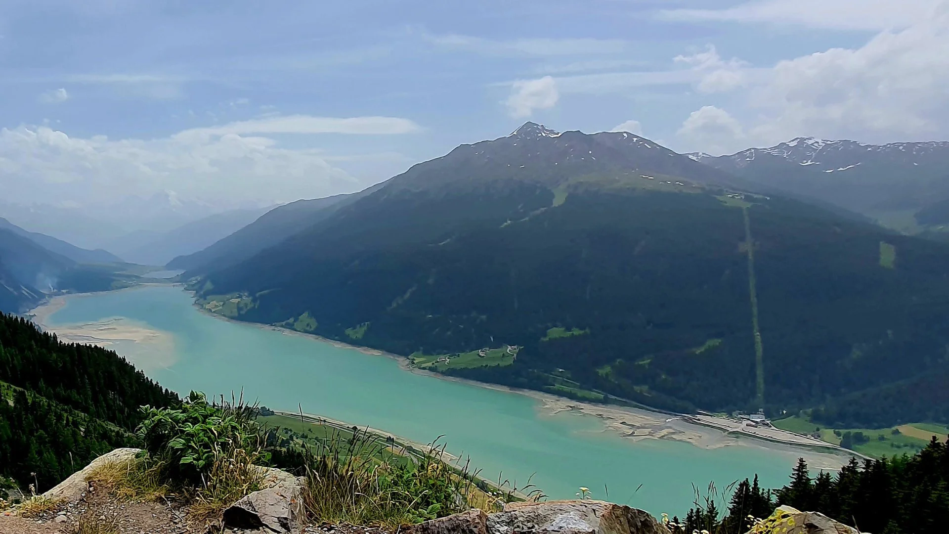 Blick vom Plamorter Aussichtsfelsen auf den Reschensee, im dunstigen Hintergrund ist der Ortler gerade noch zu erkennen.