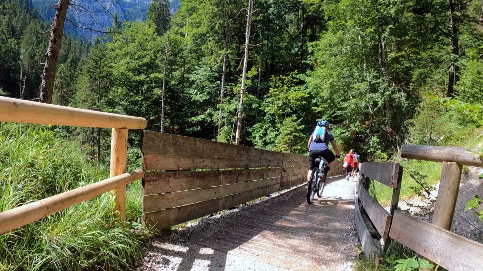 Los geht es mit dem Bike am Alpspitzbad nähe Hausberg, dann über den Kochelberg, den Hohen Weg und das Reintal bis zum Abzweig des Wanderwegs ins Oberreintal kurz vor der Bockhütte.